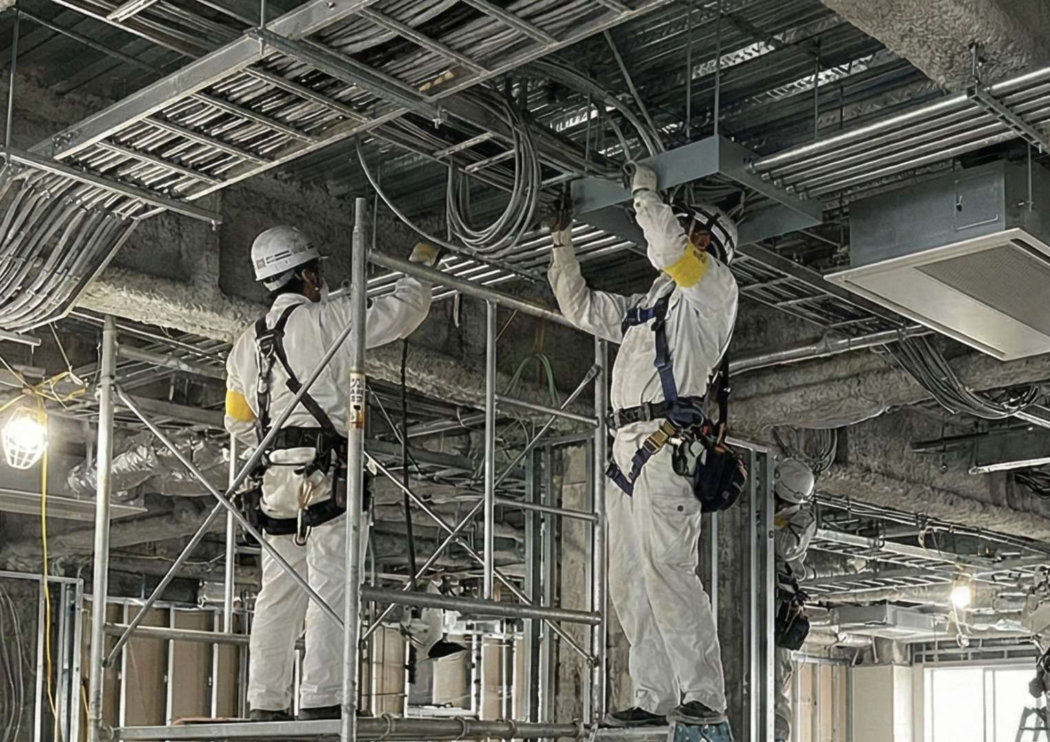 隠蔽配線が主の住宅とは異なり、露出配管の美しさが求められる場面や、幹線ケーブルのような重量物を扱うダイナミックな配線技術が磨かれます。