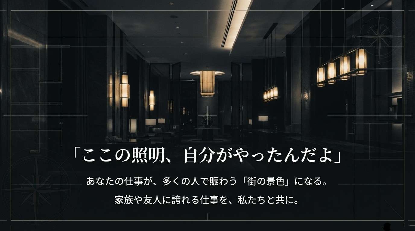 自分が手がけた店舗がオープンし、多くの人で賑わう様子を見たときの達成感は格別。「ここの照明、自分がやったんだよ」と、家族や友人に誇れる仕事です。