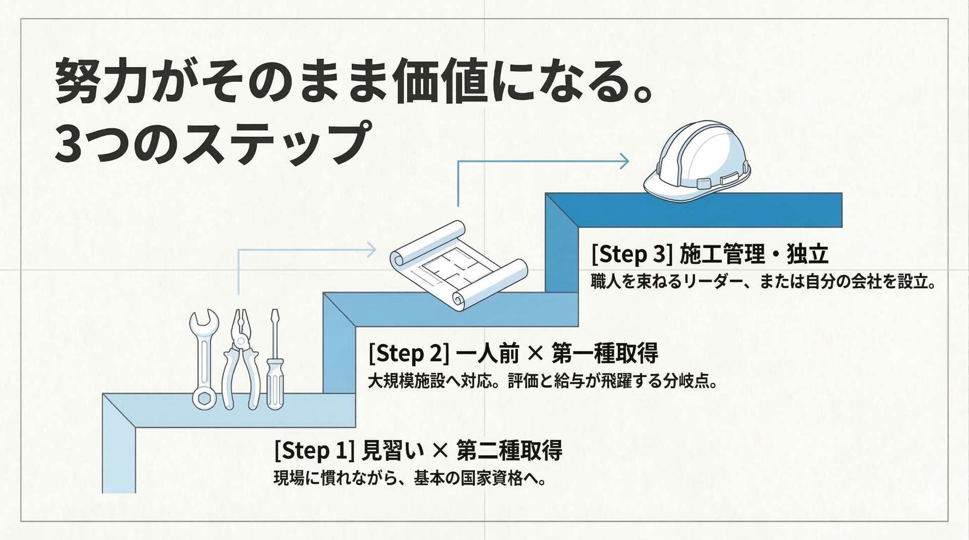 現場での実務経験と「国家資格の取得」が直接リンクしているため、あなたの努力がそのまま市場価値(給与)に反映されやすいのがこの業界の大きな魅力です。